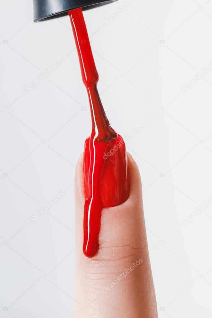 - partial view of woman applying dripping red nail polish on fingernail isolated on grey