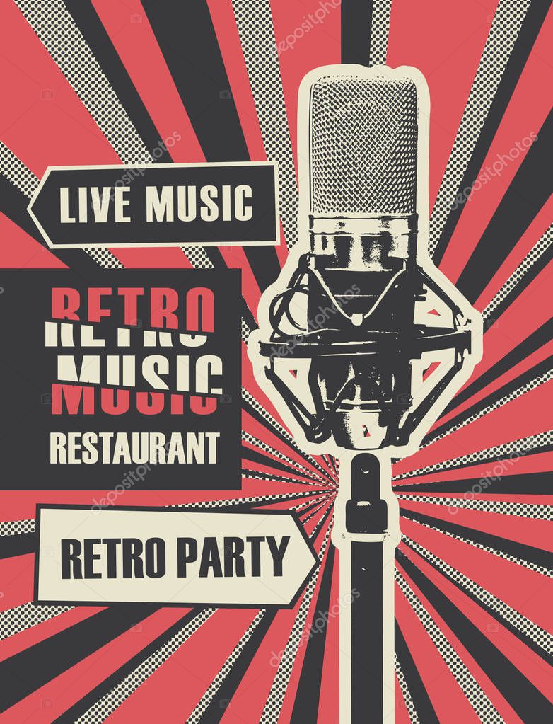 - Vector banner or restaurant menu with live music decorated with realistic microphone on bright background with rays in retro style. Retro music restaurant