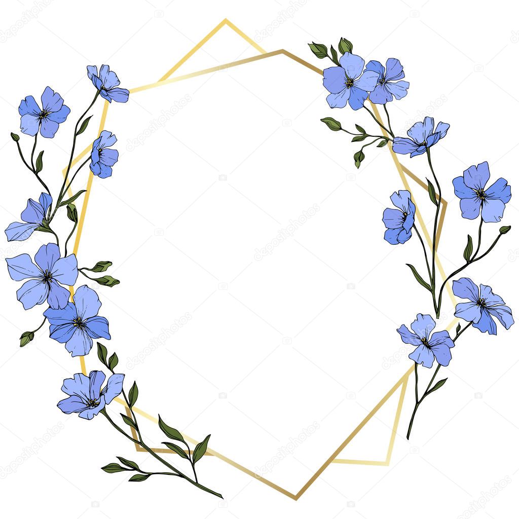 Vector. Blue flax flowers with green leaves and buds. Engraved ink art. Frame golden crystal. Geometric crystal stone polyhedron mosaic shape.