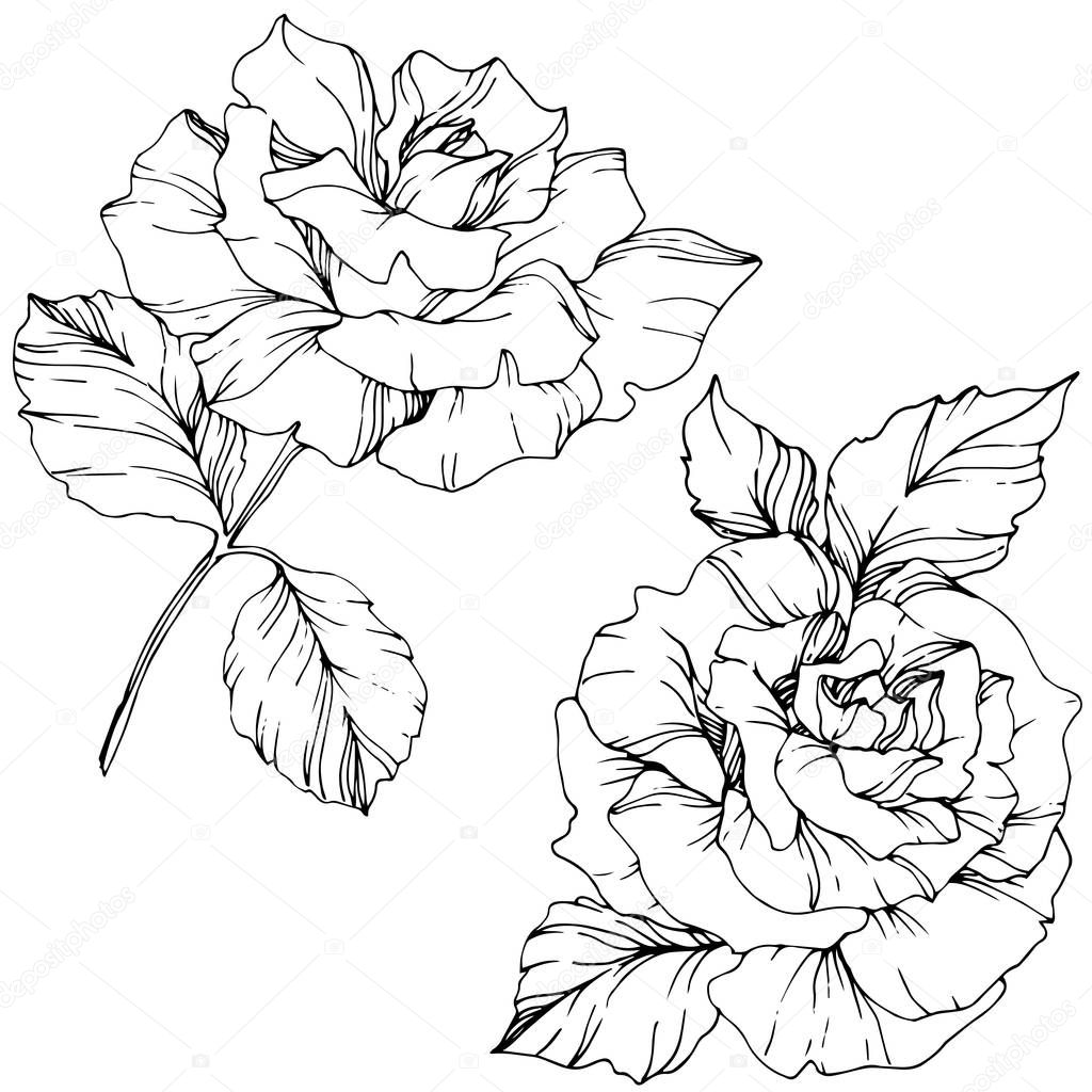 - Beautiful vector rose flowers isolated on white background. Black and white engraved ink art.