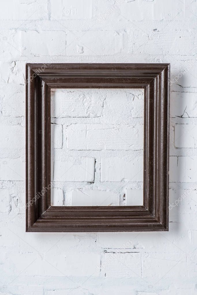 - black empty frame hanging on white brick wall