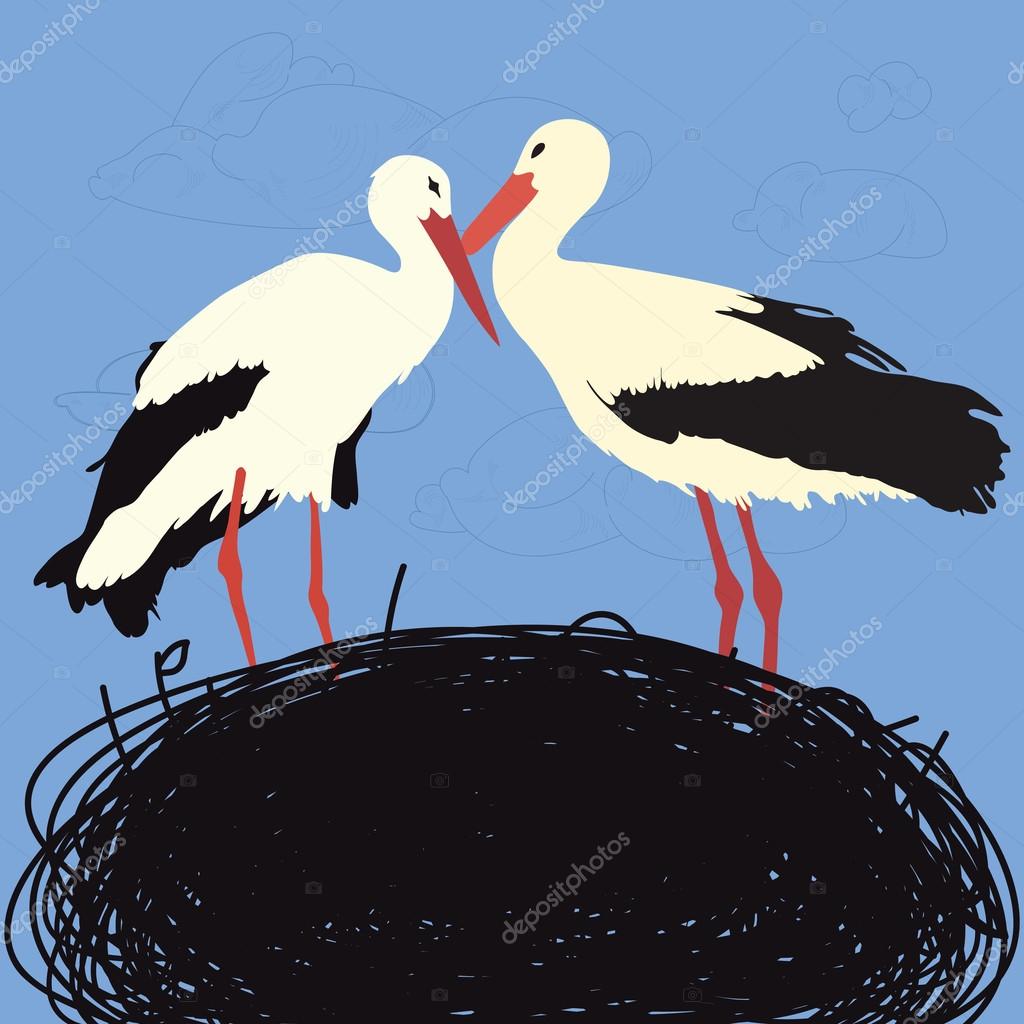Vector illustration with storks in nest with gentle clouds on the background
