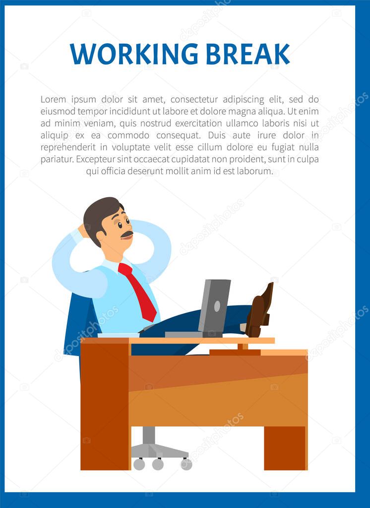 Working break, boss resting in office, put legs on table. Leader with mustaches in relaxed pose. Chief worker dreaming at workplace, poster with text sample