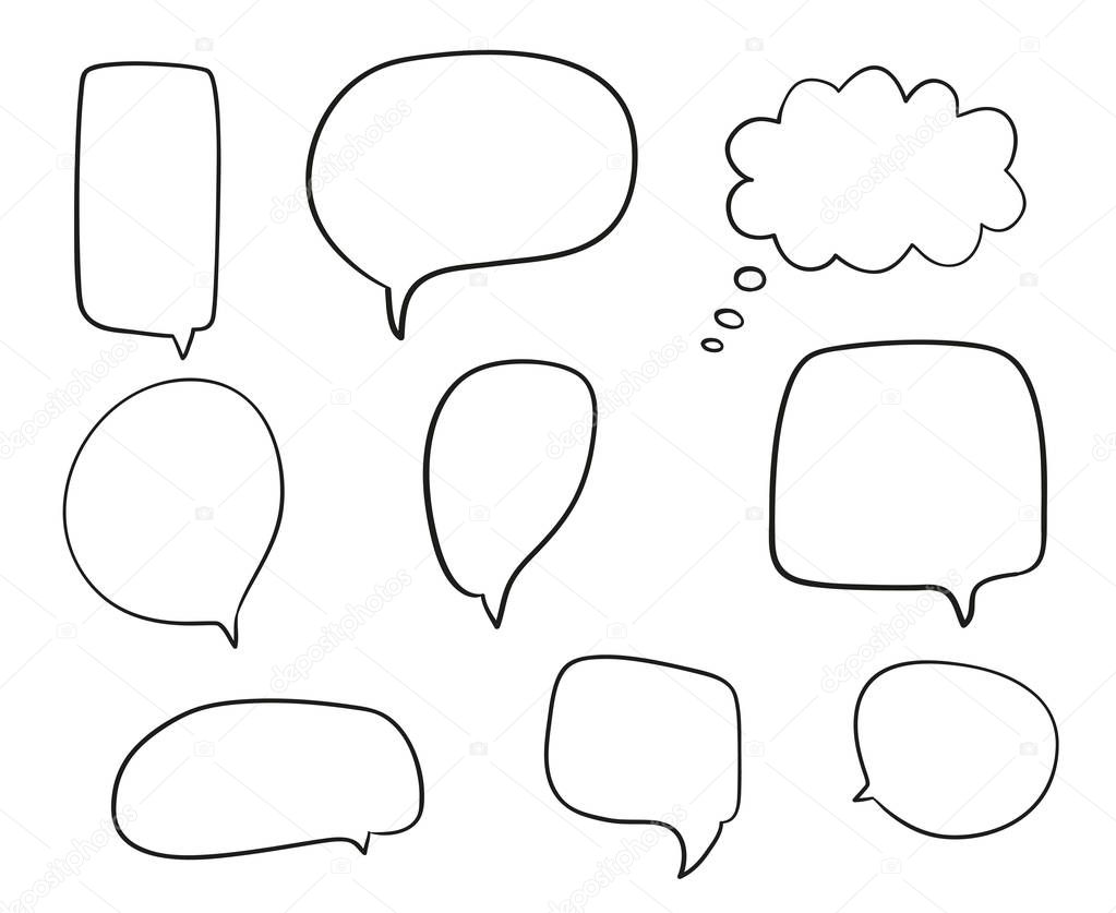 - Set of hand drawn think and talk speech bubbles. Abstract symbols on white. Pattern of loot for words. Line art. Collection of different signs. Black and white illustration