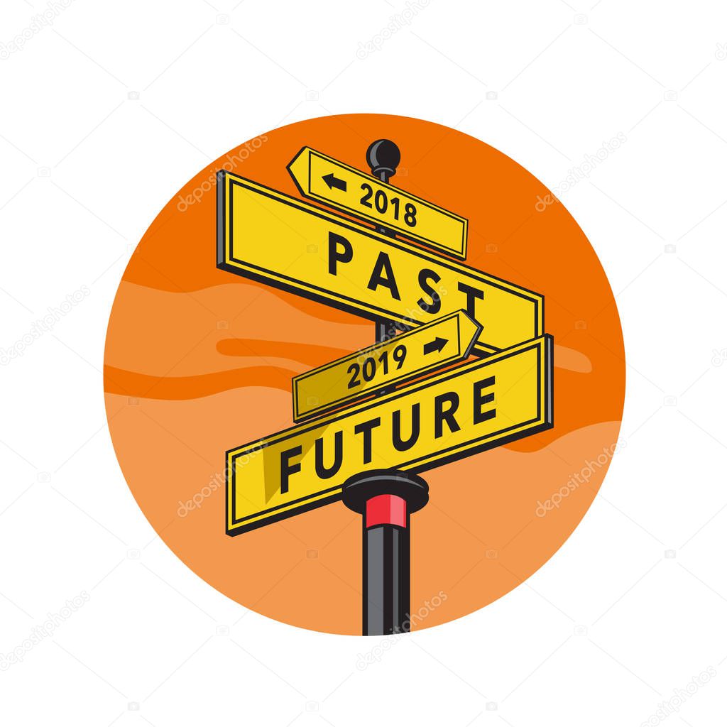 - Retro style illustration of a directional signpost showing 2018 Past and 2019 Future sign direction set inside circle on isolated background.