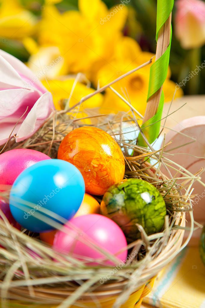 Close-up view of decorative easter basket with colorful painted eggs