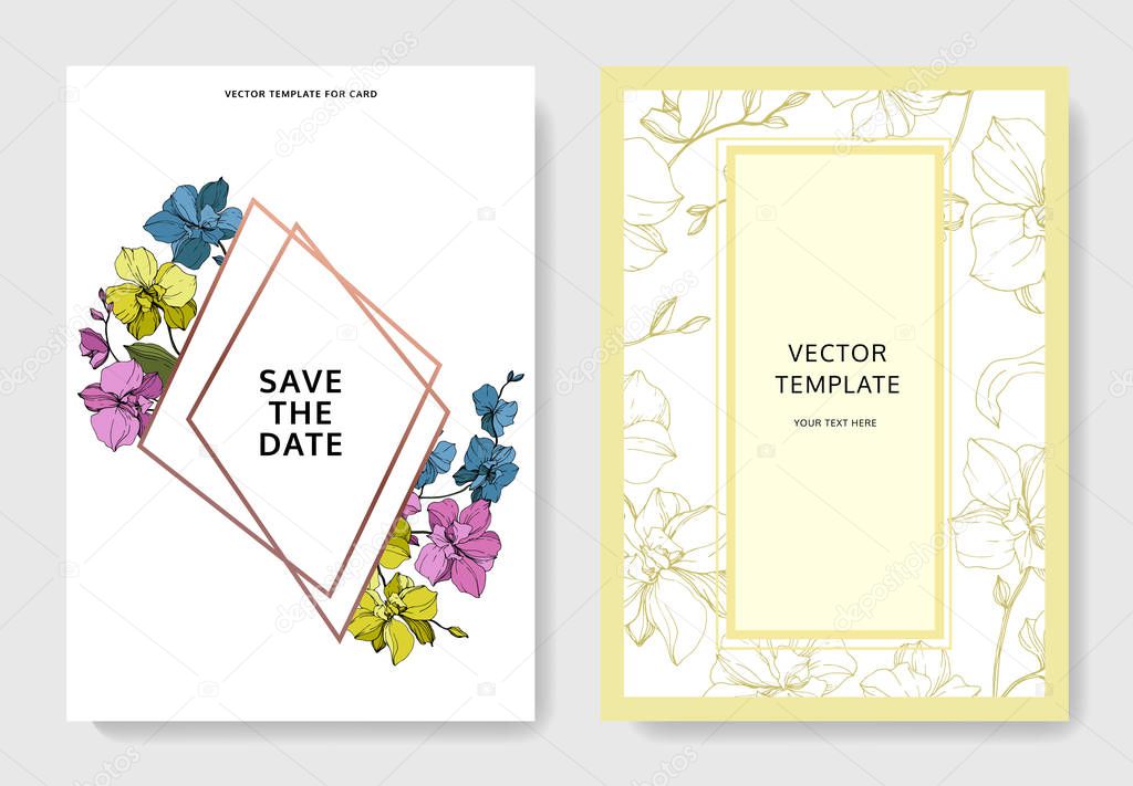 Vector blue, pink and yellow orchids isolated on white. Invitation cards with save the date lettering