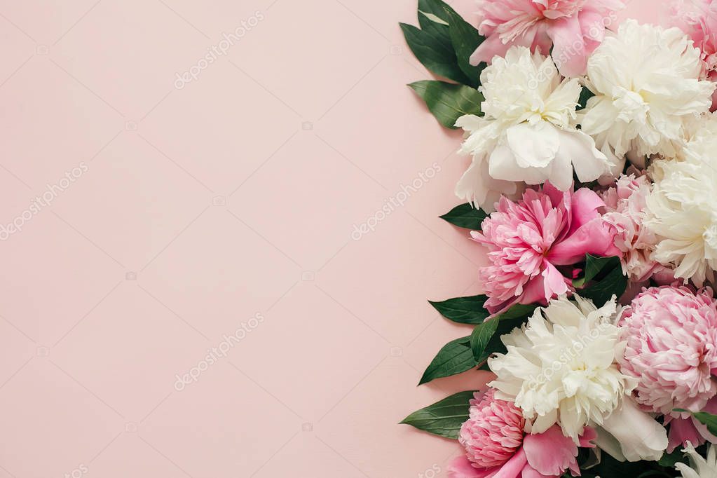 International Womens Day. Stylish peonies flat lay. Pink and white peonies border on pastel pink paper with space for text. Happy mothers day, floral greeting card mockup. Valentines day.