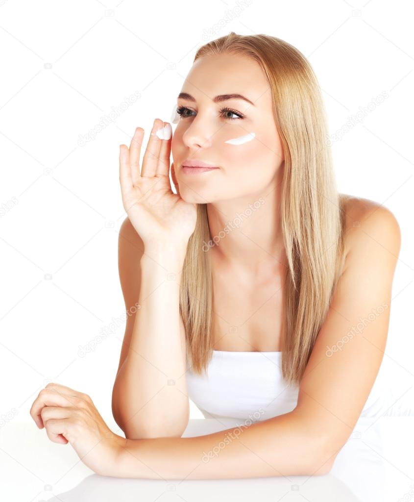 Closeup portrait of cute blond female applying natural facial cream isolated on white background, luxury moisturize cosmetics, enjoying day spa