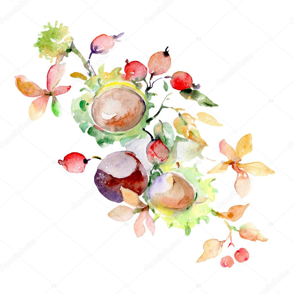 Bouquet of autumn forest fruits. Wild spring leaf isolated. Watercolor background illustration set. Watercolour drawing fashion aquarelle. Isolated bouquet illustration element.