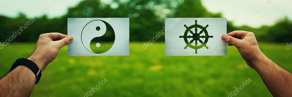 - Religion conflicts as global issue concept. Two hands holding different faith symbols of China, Buddhism vs Taoism belief over green field nature. Relations between different people doctrines and cult