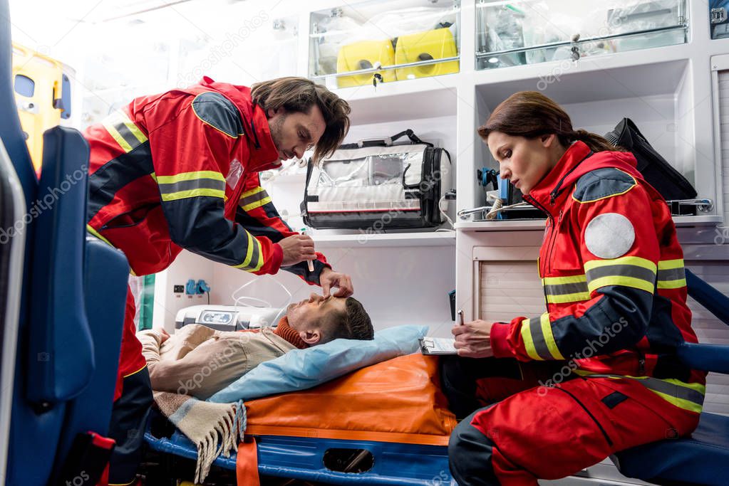 Paramedics doing eye examining in ambulance car