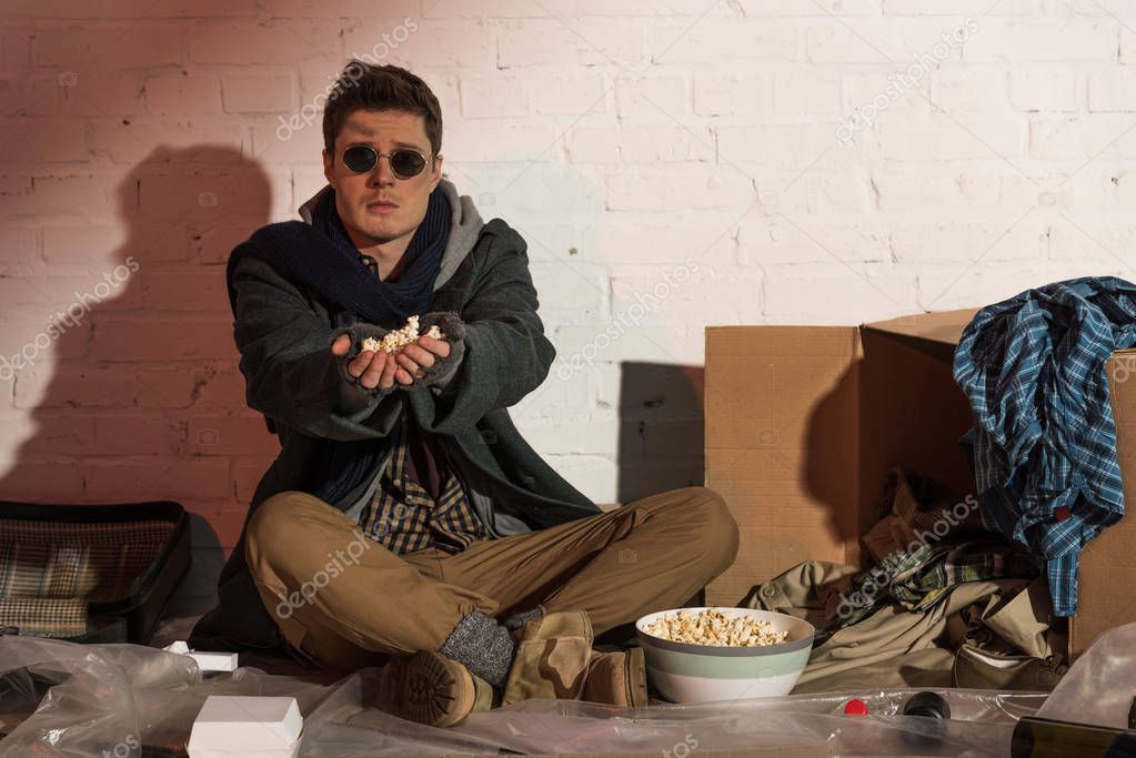 - homeless man sitting by white brick wall and stretching hands with popcorn