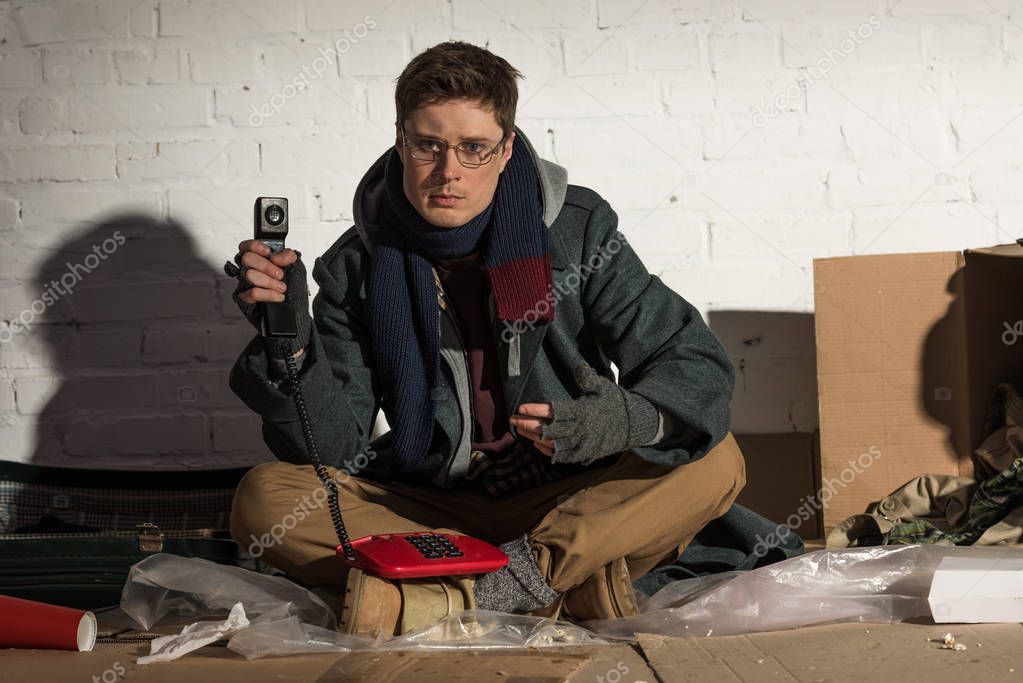 RED WHITE OBJECTS PERSON ADULT PEOPLE CAUCASIAN LIFE MALE MAN CONNECTION RETRO VINTAGE URBAN COMMUNICATION PHONE TALK TELEPHONE SHADOW STREET USING DIRTY RUBBISH TRASH LONELINESS GARBAGE MISERABLE GLASSES LONELY MUDDY HOOD DESPAIR POOR POVERTY DUMP HOMELESSNESS HOMELESS SPECTACLES BEGGAR NEED POORNESS DESTITUTE HOBO COPY SPACE BRICK WALL SOCIAL PROBLEM