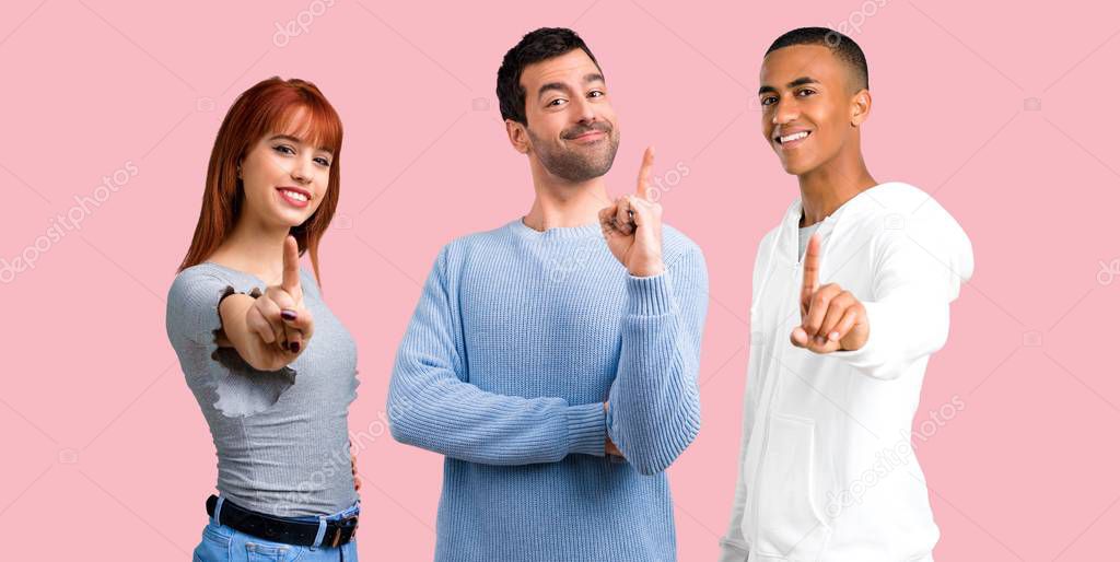 Group of three friends counting number one sign