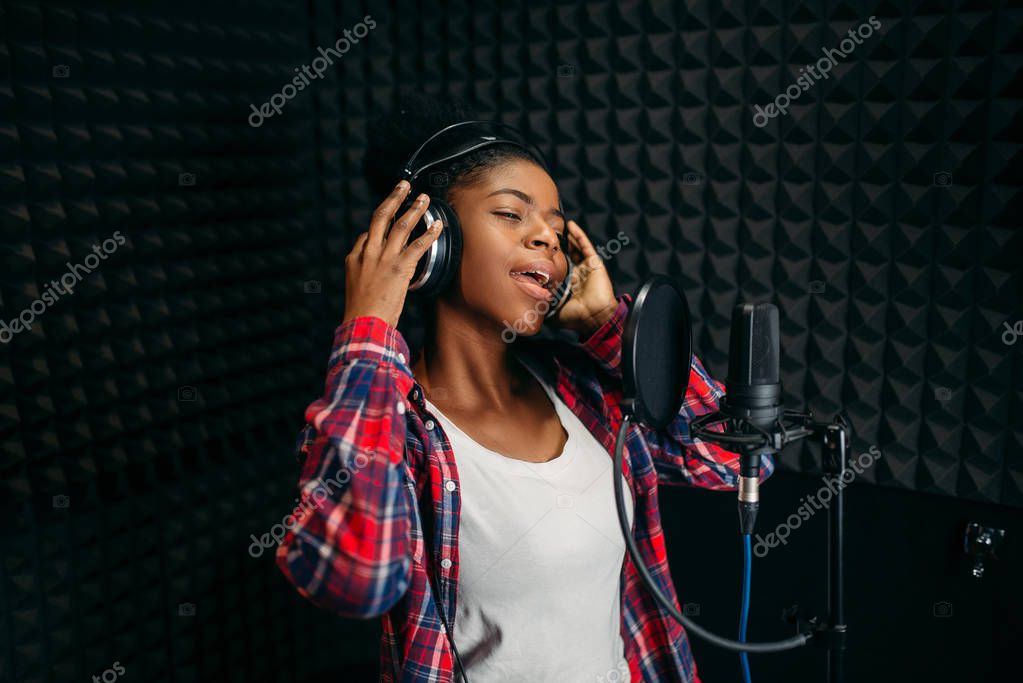 - Female singer in headphones songs in audio recording studio. Musician listens composition, professional music