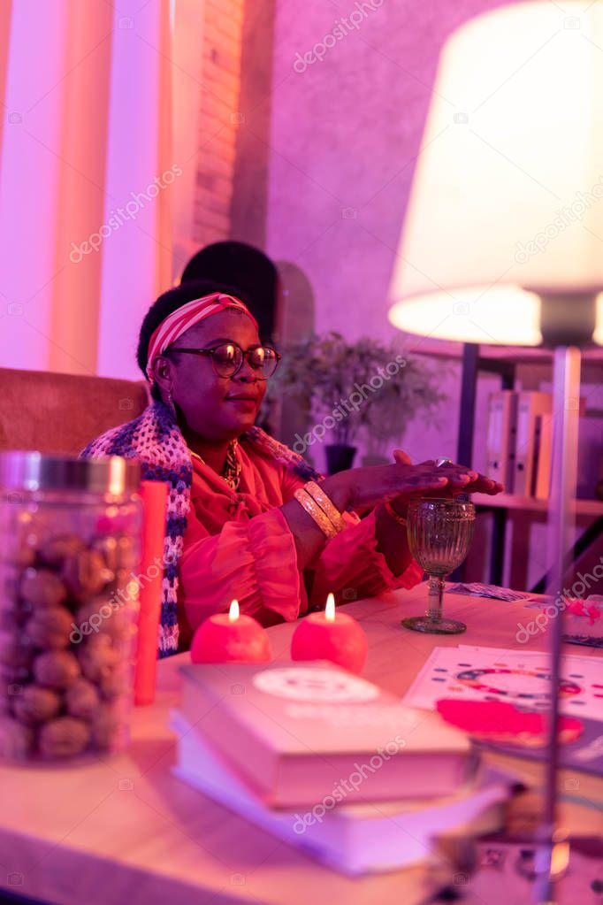 Busy with work. African american plump fortune-teller wearing golden watch sitting at the table while doing witchery work