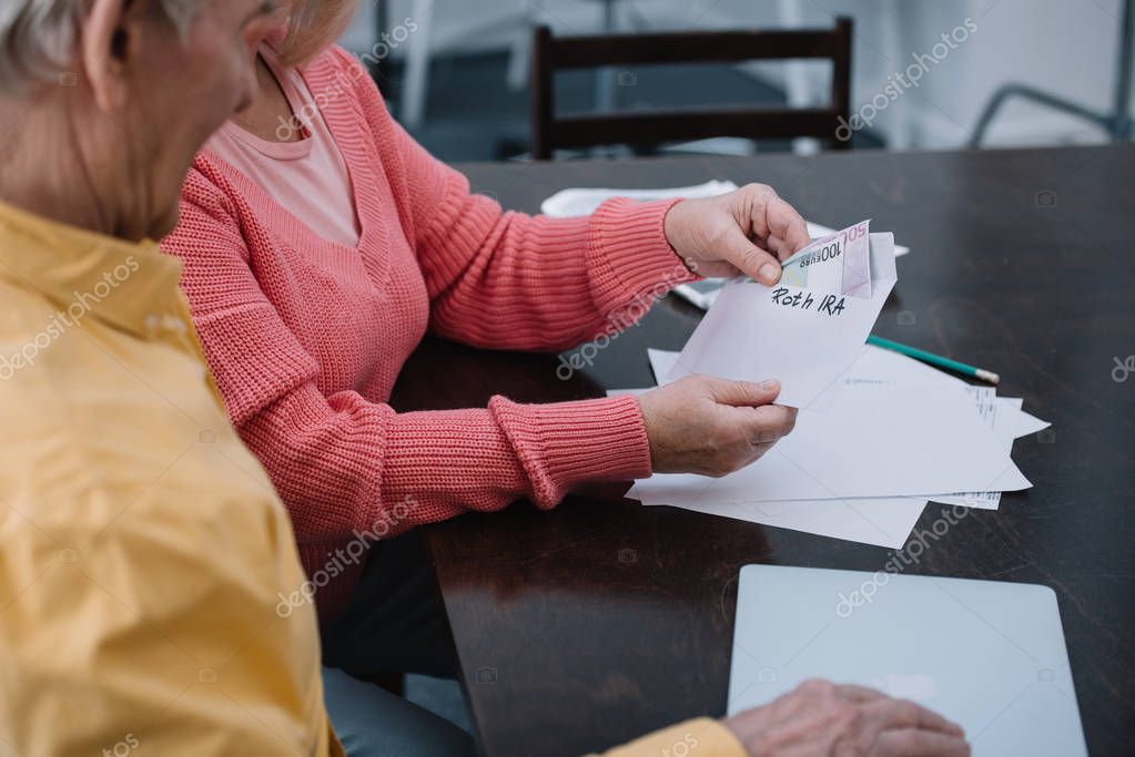 - partial view of senior couple holding envelope with 'roth ira' lettering and money while sitting at table