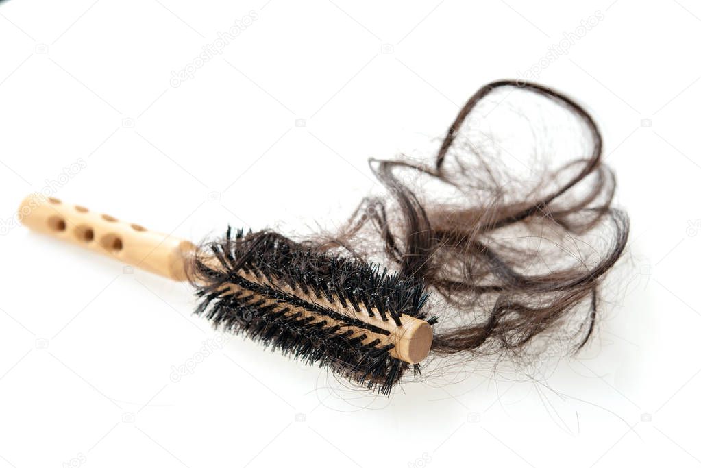 Hairloss problem. Brush with lost hair on it, isolated on white background.