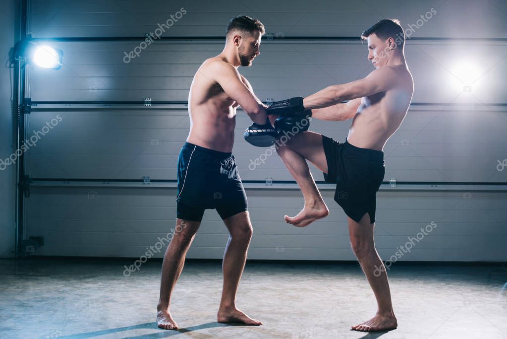 Athletic muscular mma fighter practicing kick with another sportsman during training