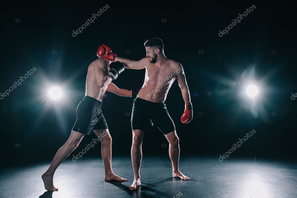 SPORT CAUCASIAN BLACK DARK MEN STRONG SPORTIVE FIT EXERCISING SPORTSMEN PUNCHING BAREFOOT TRAINING FIGHTING FIGHT SPORTING ATHLETIC MUSCULAR ATHLETES BACKLIT KICKBOXING PUNCH BOXING SPORTY SPORTSWEAR BOXERS FIGHTERS MMA TORSOS TWO PEOPLE STUDIO SHOT BACK LIGHT YOUNG ADULT MARTIAL ARTS BOXING GLOVES MUAY THAI SPORT EQUIPMENT MIXED MARTIAL ARTS THAI BOXING COMBAT SPORT