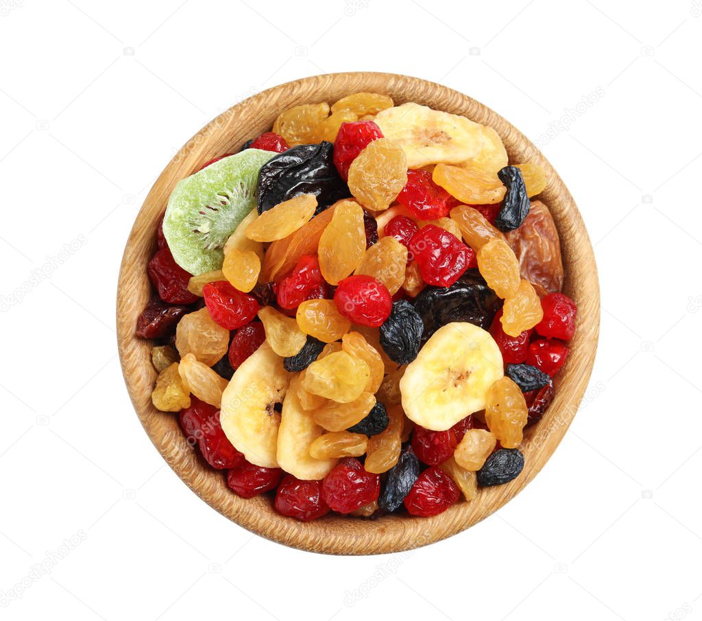 - Bowl with different dried fruits on white background, top view. Healthy lifestyle