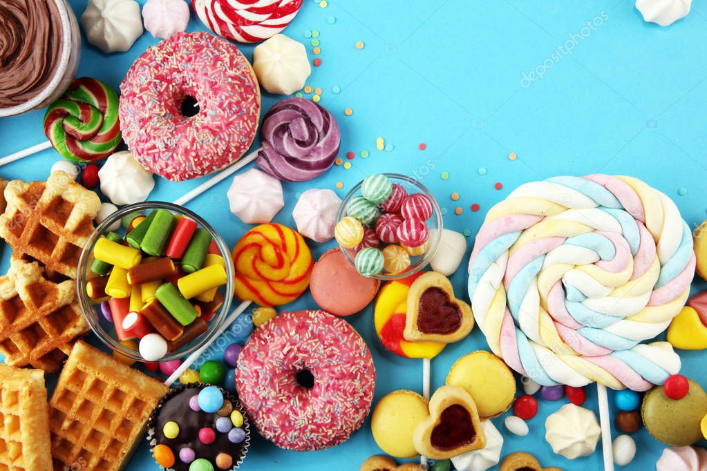 Candies with jelly and sugar. colorful array of different childs sweets and treats on blue background