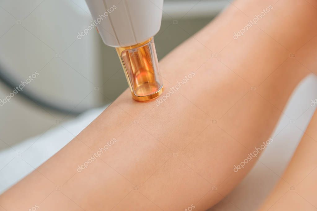 Partial view of woman receiving laser treatment on leg