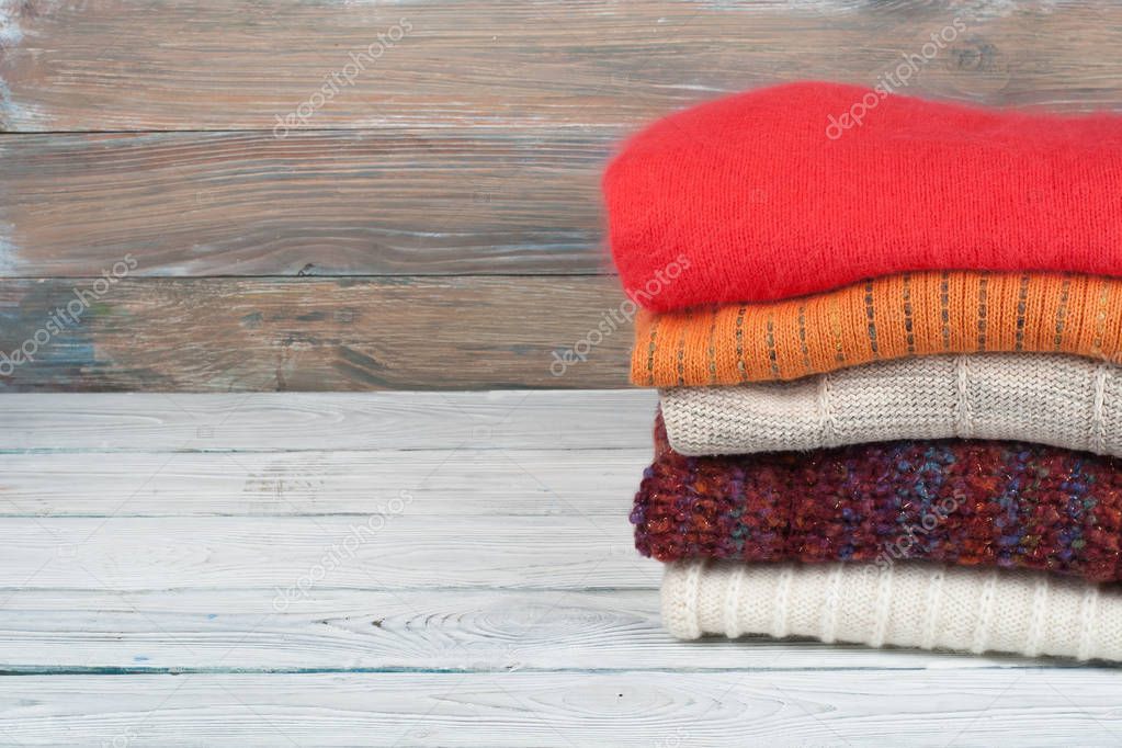 - Knitted wool sweaters. Pile of knitted winter clothes on wooden background, sweaters, knitwear, space for text