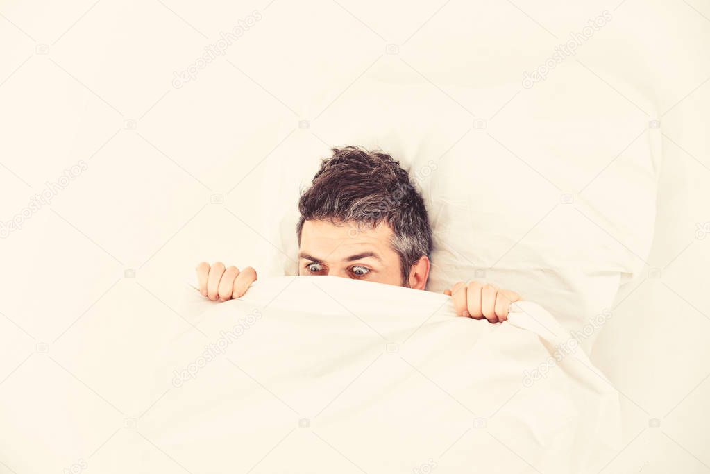 Nightmare concept. Guy hides face under blanket. Man with scared face lies on pillow under blanket. Man wants to stay in bed, white background, top view, close up.