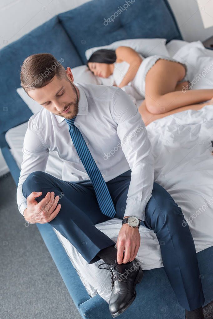 Selective focus of bearded man in suit touching shoelaces near sleeping woman