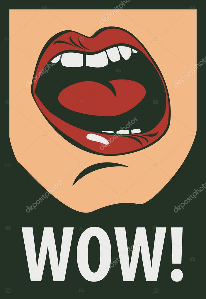 Vector illustration with human mouth screaming wow. Open mouth and WOW Message, promotional background, presentation poster. Lips, tongue and teeth of a young girl with a red lipstick