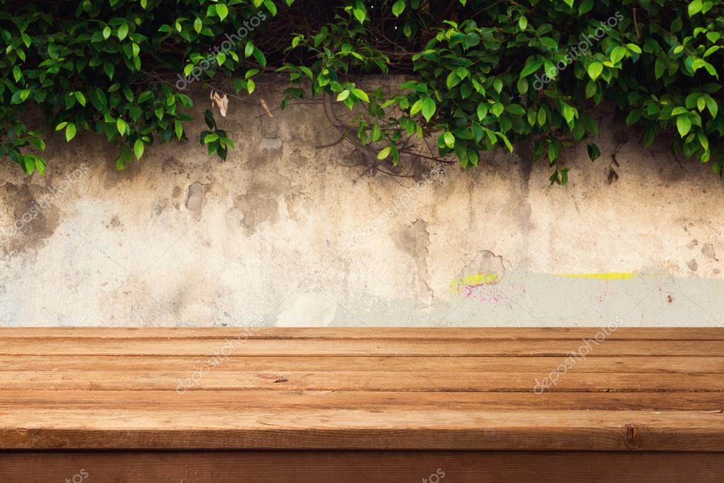 - Wooden deck table over urban wall with leaves
