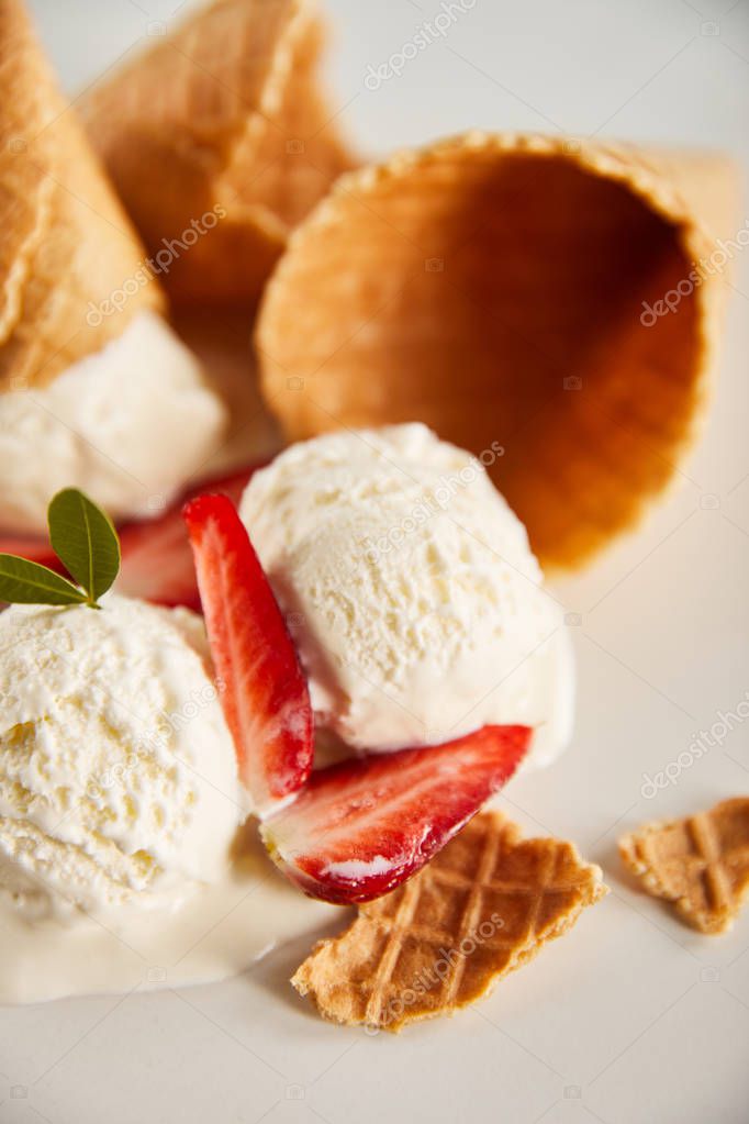 - close up view of waffle cones and delicious melting ice cream with strawberries on grey