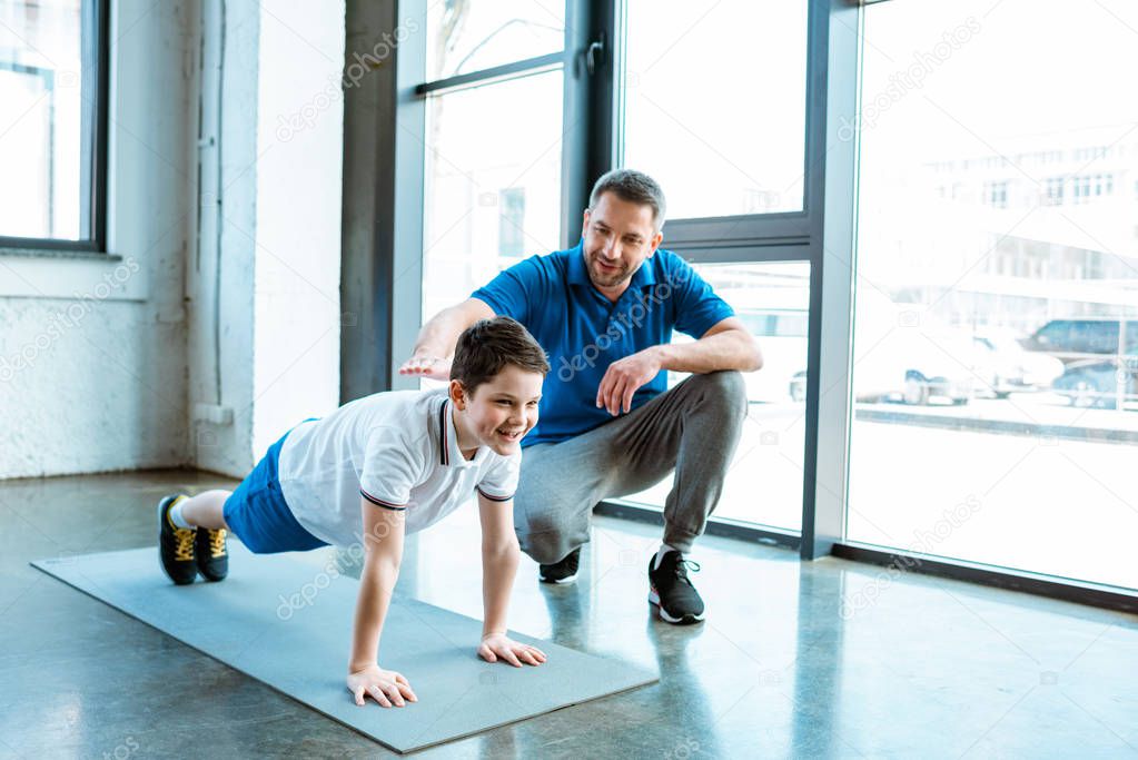 - father helping son with push up exercise at gym with copy space