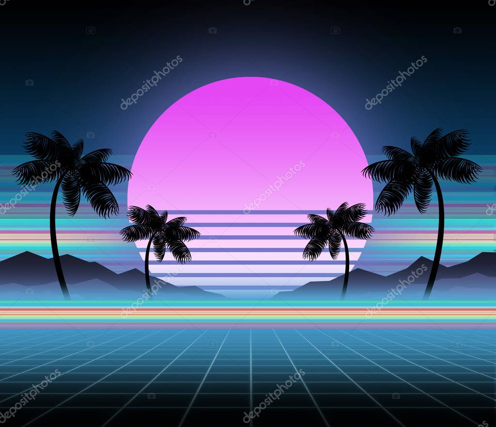 - Synthwave and retrowave background template. Palms, sun and space in computer game. Retro design, rave music, 80s computer graphics and sci-fi technology concept.