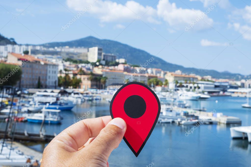Closeup of the hand of a young caucasian man with a red marker pointing the Port of Ajaccio, in Corsica, France
