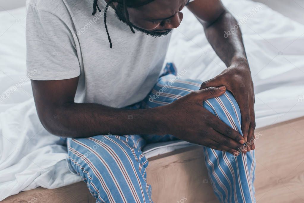 cropped view of young african man suffering from knee pain in bedroom
