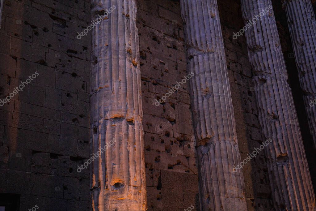 ROME, ITALY - JUNE 28, 2019: concrete wall and ancient columns