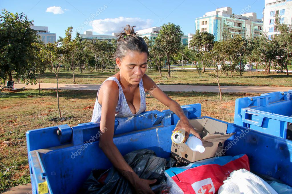 - Brasilia, D.F., Brazil- June 11, 2019: A poor young mother digging through the Trash in an affluent neighborhood in the capital city of Brasilia, to try and earn some money to feed her kids.