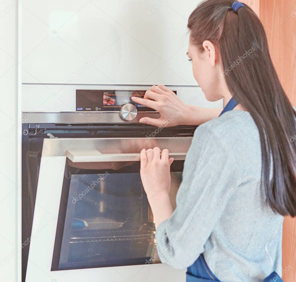 - Beautiful woman in the kitchen, waiting with the front of the oven