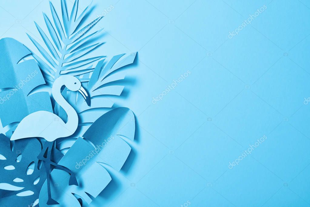 - top view of blue minimalistic paper cut palm leaves on blue background with copy space