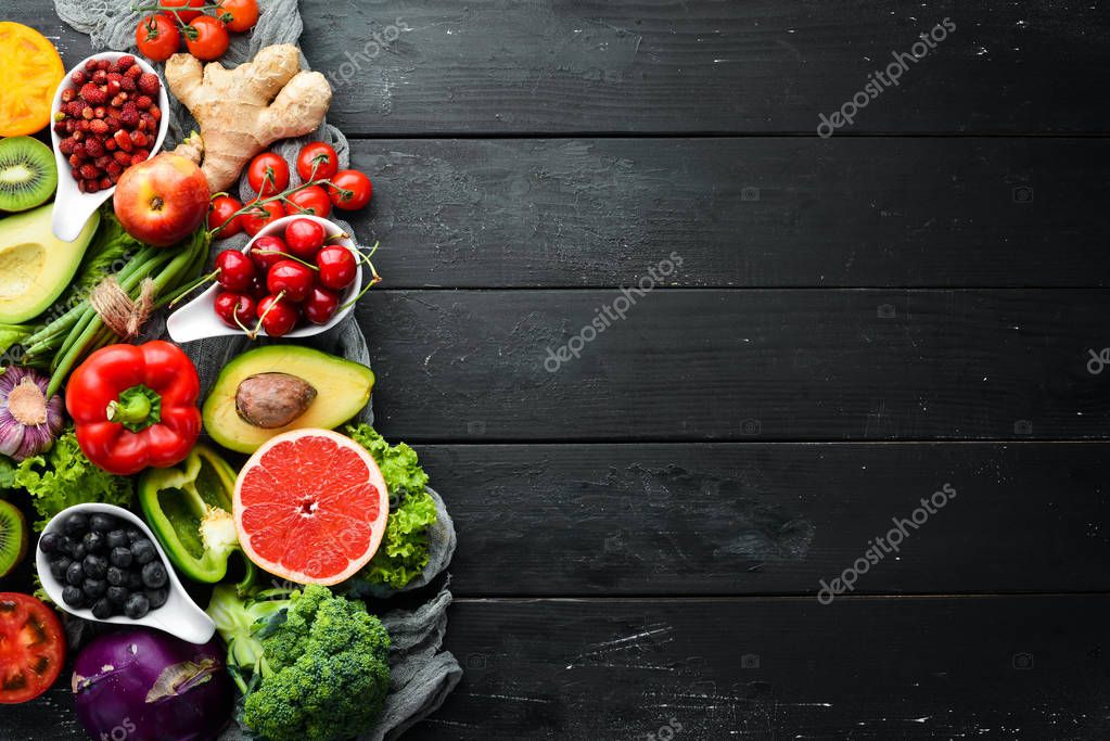 - Fresh vegetables and fruits on a black background. Vitamins and minerals. Top view. Free space for your text.