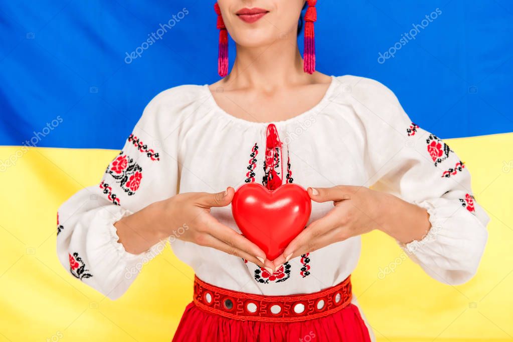 Partial view of young woman in national Ukrainian costume holding red heart with flag of Ukraine on background