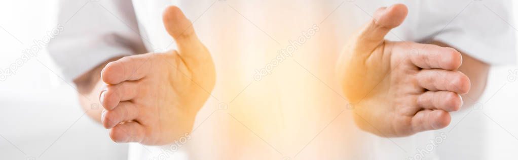 - panoramic shot of healer cleaning aura on white
