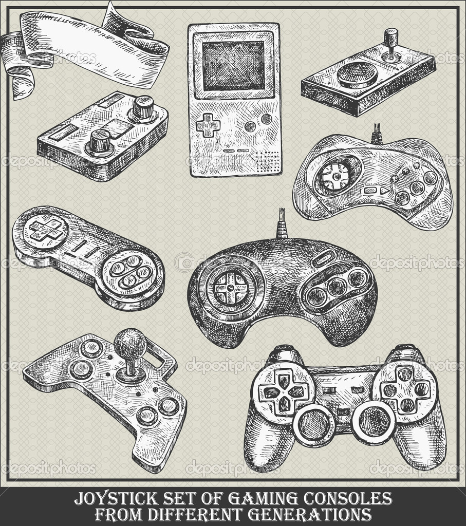 - Joystick set of gaming consoles from different generations. Vector sketch illustration