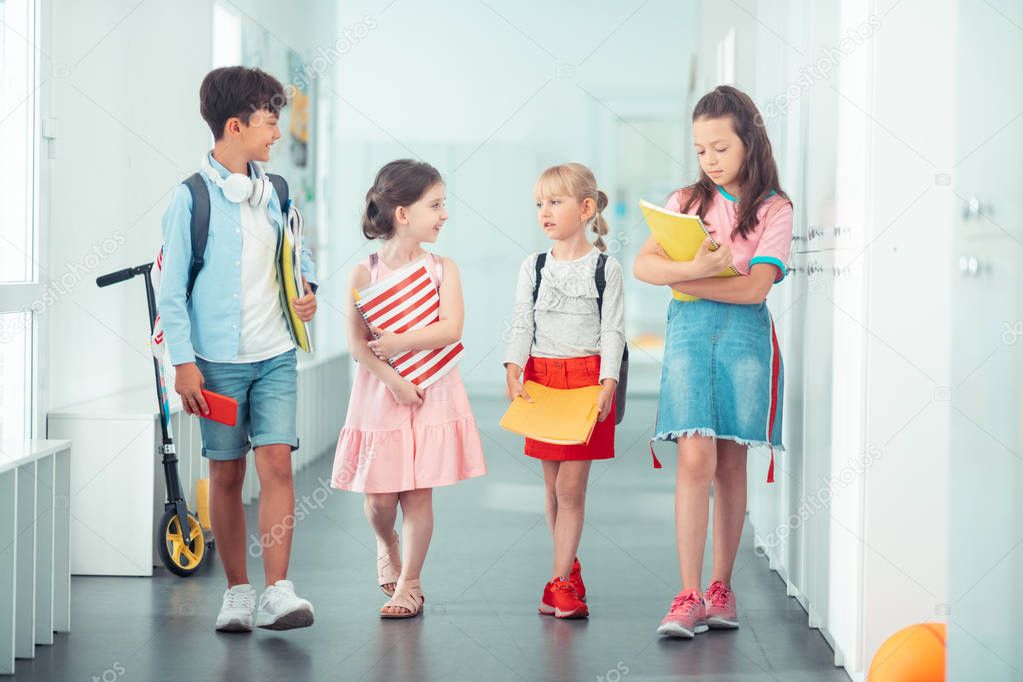 Boy and girls. Cheerful stylish boy and girls going to classroom and discussing schedule