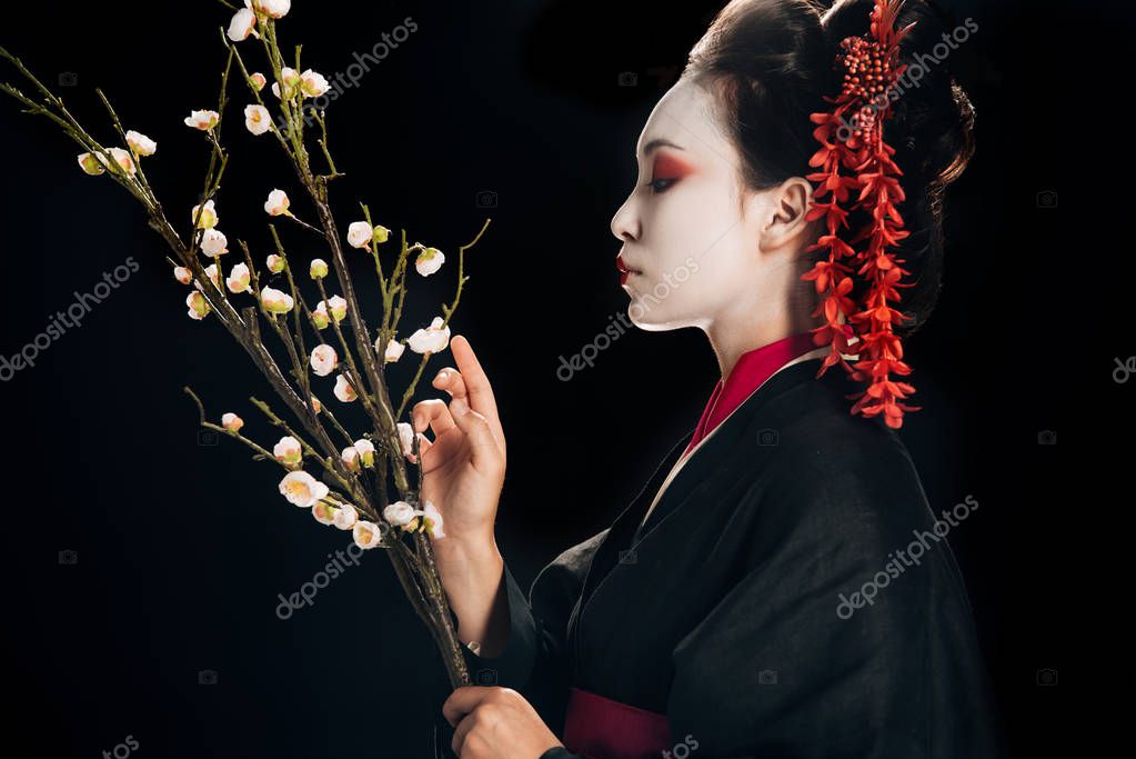 - side view of beautiful geisha in black kimono with red flowers in hair holding sakura branches isolated on black