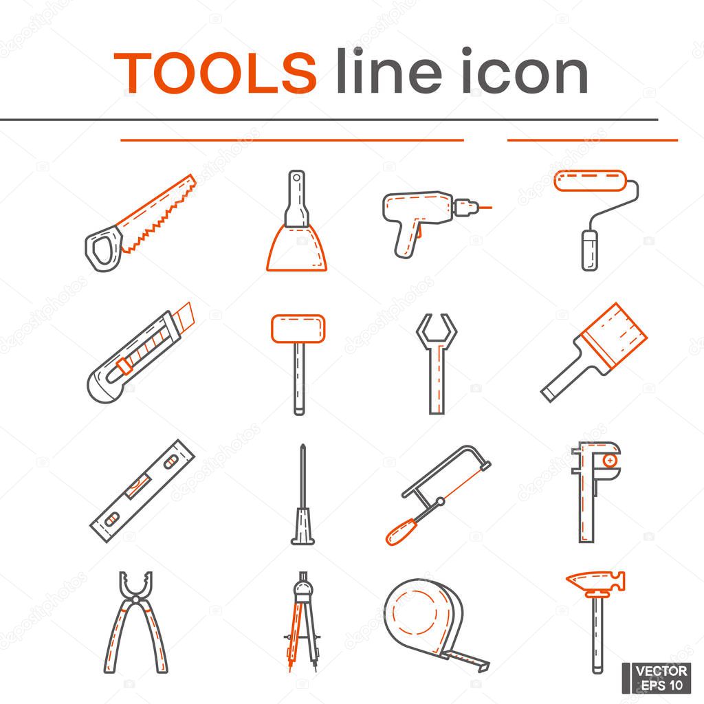 Vector image. Set of line icons on the theme of tools. Black and red outline sign.