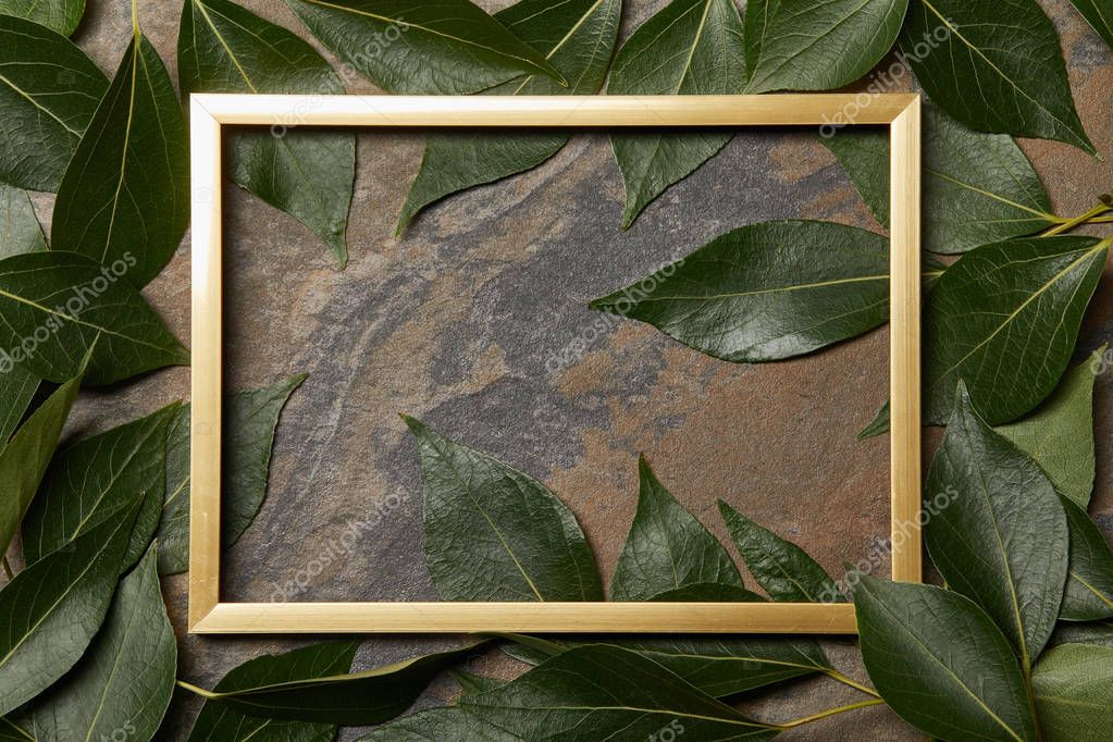 top view of empty golden frame on stone background with copy space and green fresh leaves